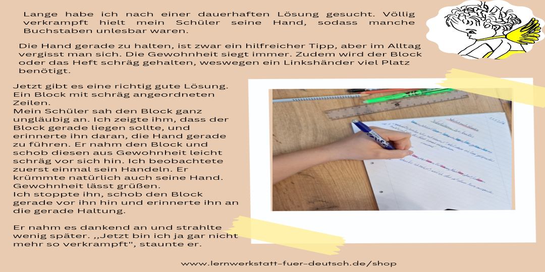 Lange habe ich danach gesucht, und zwar eine hilfreiche Lösung für meine Linkshänder. Die krampfhalte Stiftführung sorgte bei dem einen oder anderen für Schmerzen, sodass die Buchstaben im hinteren Teil der Zeile unlesbar wurden. Der Schreibblock oder das Heft wurde schräg positioniert, weswegen die Betroffenen mehr Platz am Tisch beanspruchten als die anderen. Zudem schmierte die linke Hand die frische Tinte, wenn diese ungünstig positioniert war.