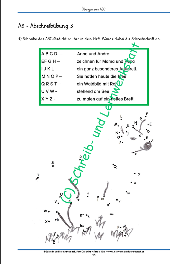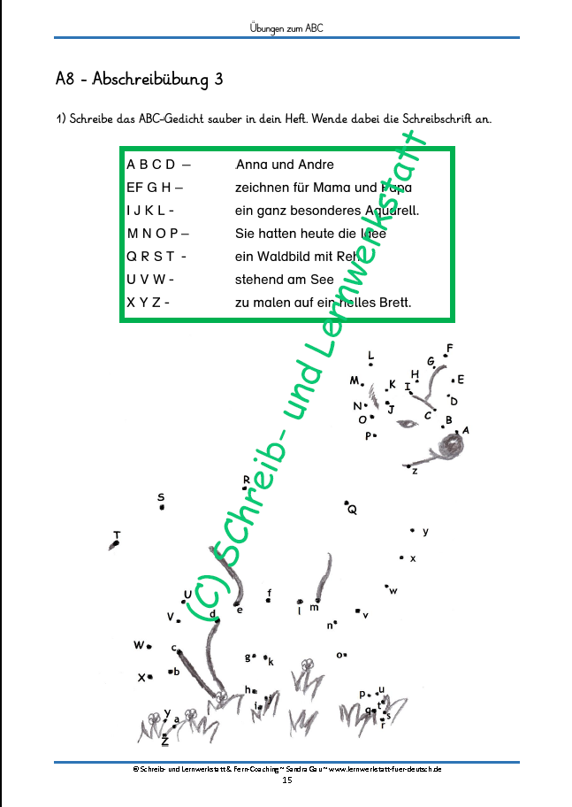 Die Lernseiten zum Alphabet bieten einen hilfreichen Übergang zum richtigen Schreibenlernen. Darin wird die Schreibschrift geübt, die Reihenfolge des ABC's unter die Lupe genommen sowie lesen und abschreiben geschult. ABC-Geschichten sorgen für Unterhaltung und das Malen nach dem ABC trainiert die Achtsamkeit und Konzentration. Das Lernmaterial endet mit den Namen der Buchstaben und birgt in sich so einige Rätsel. Begib dich auf die spannende Reise zum ABC mit deinen Schülern oder mit deinem Kind daheim.