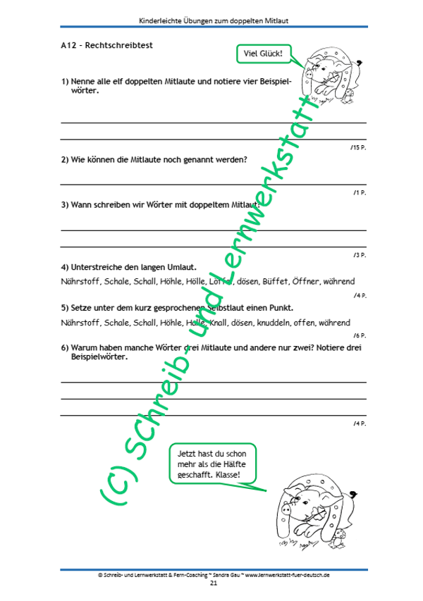 Das Lernmaterial enthält abwechslungsreiche, in die Tiefe gehende Übungen zu Wörtern mit doppelten Mitlauten. Die Rechtschreibregeln zum Doppelkonsonanten eignen sich als leichten Einstieg in das richtige Schreiben. Mit dem Einüben der Schreibweisenbegründung sorge ich in meinem Förderunterricht für nachhaltiges Verinnerlichen des Erlernten.