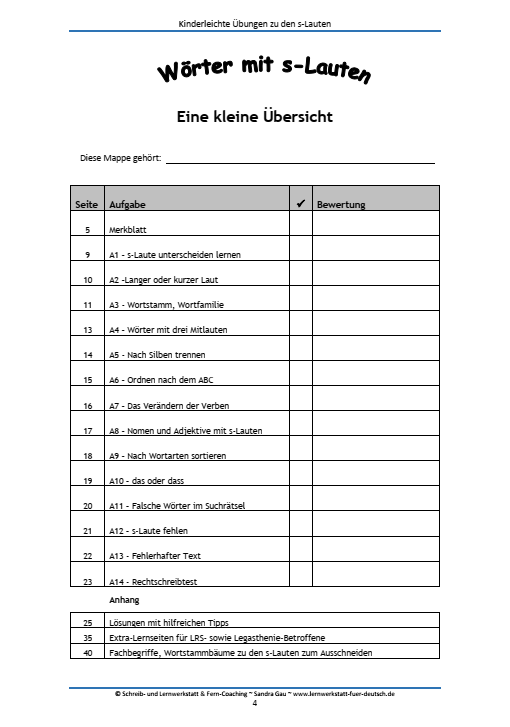 Das Lernmaterial enthält abwechslungsreiche, in die Tiefe gehende Übungen zu Wörtern mit s-Lauten. Die Doppelkonsonanten sowie die Wörter mit ck, k, tz, z im In- und Auslaut wurden gefestigt. Jetzt eignen sich die Übungen zu den drei s-Lauten: s, ss, ß.