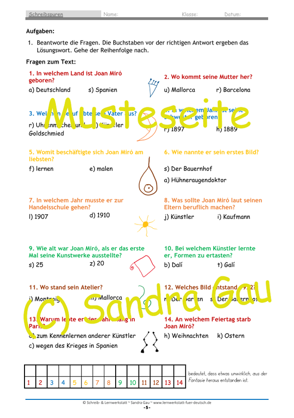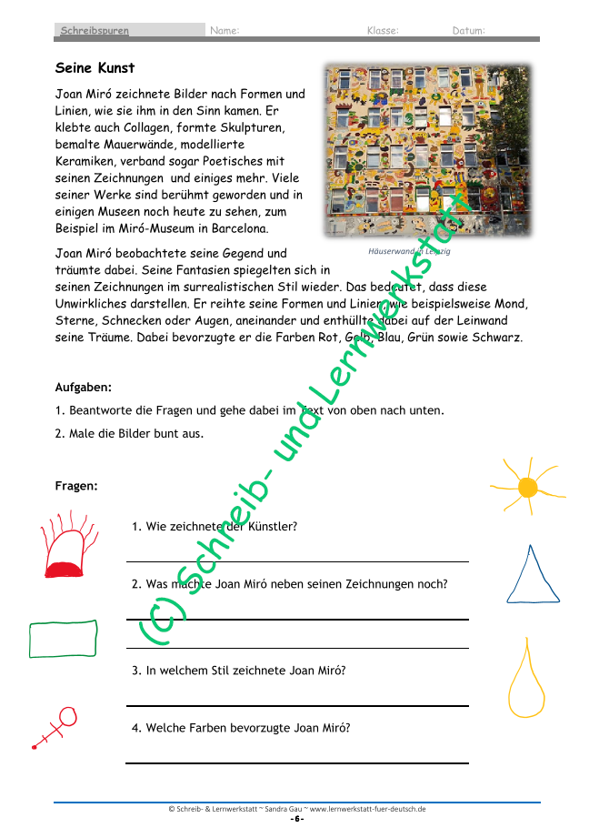 In diesem Lernmaterial erfahren die Kinder Wissenswertes zu Joan Miró und üben das Textverständnis anhand von Fragen. Nach dem ersten Sachtext biete ich Fragen zum Ankreuzen, die mit einem Rätsel verbunden sind, und nach dem zweiten Sachtext müssen sie mit eigenen Worten antworten.