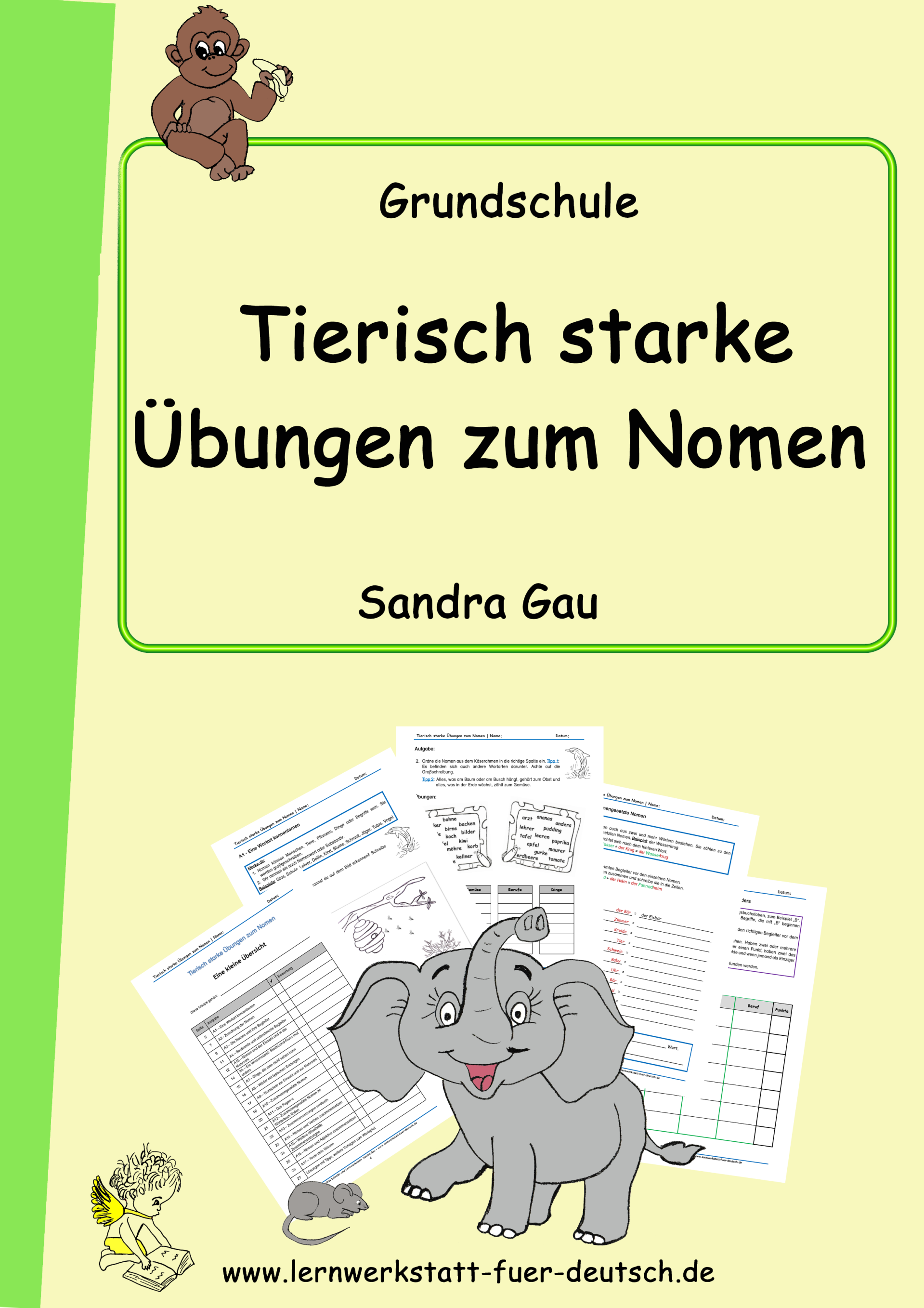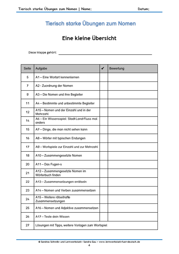 Nachdem das lernende Kind die Wortart kennengelernt hat, werden die Nomen den Tieren, Menschen, Dingen, Pflanzen und Berufen zugeordnet. Die Begleiter - unbestimmt und bestimmt - spielen bei allen weiteren Übungen eine tragende Rolle. Zusammengesetzte Nomen werden sehr vielseitig betrachtet, wobei das Nachschlagewerk immer hinzugezogen wird. Am Ende wird das Wissen getestet.