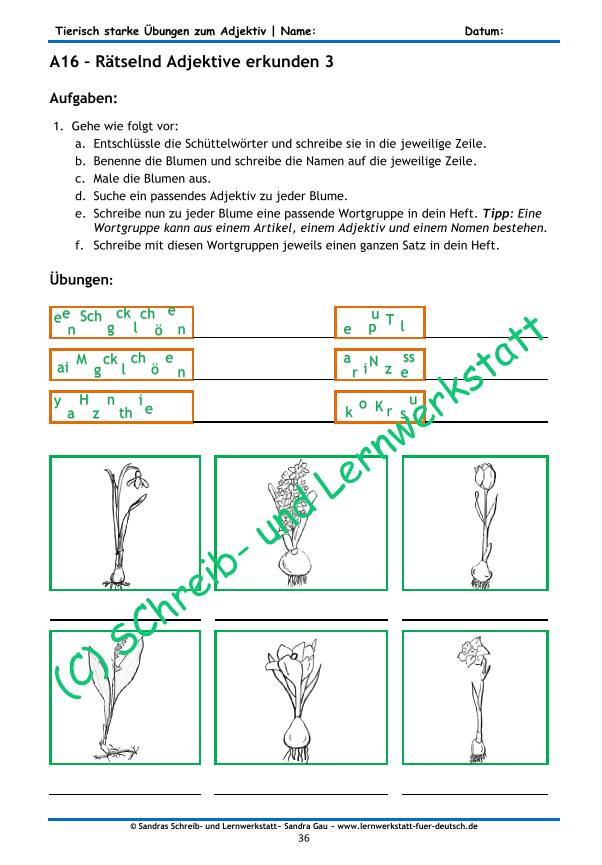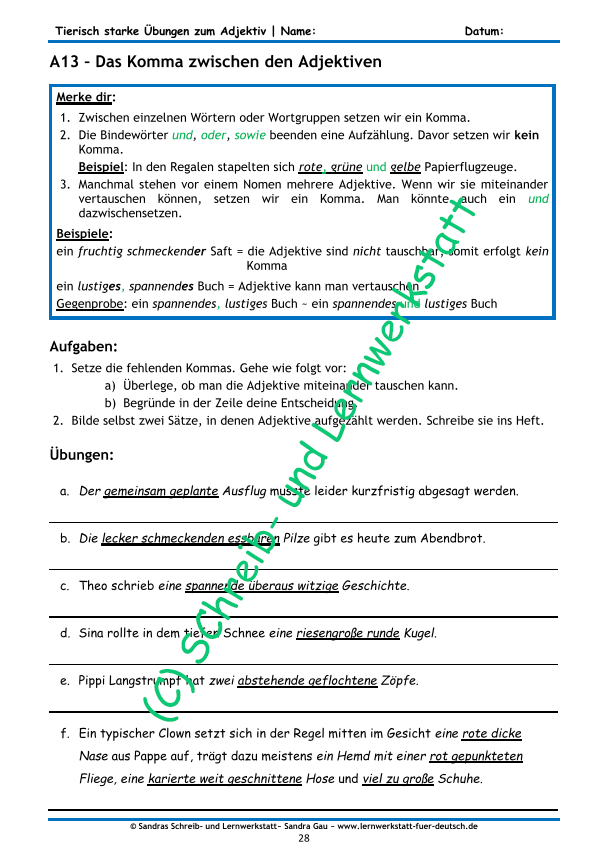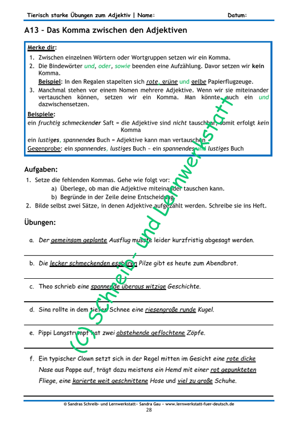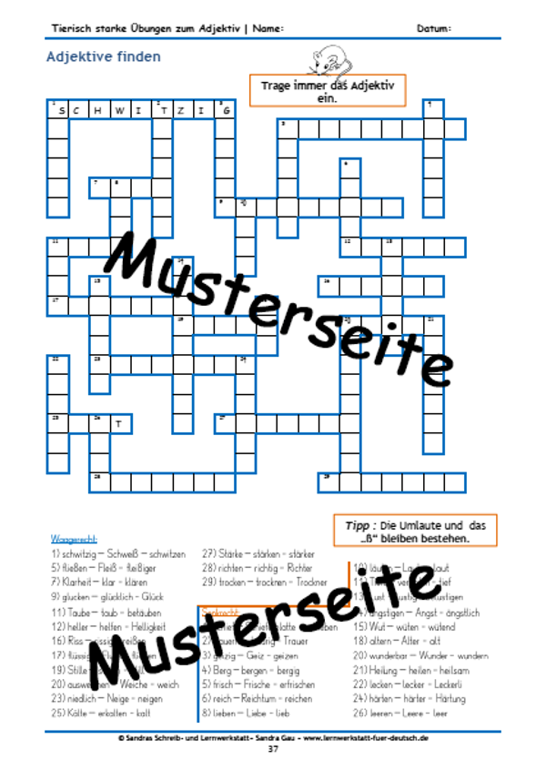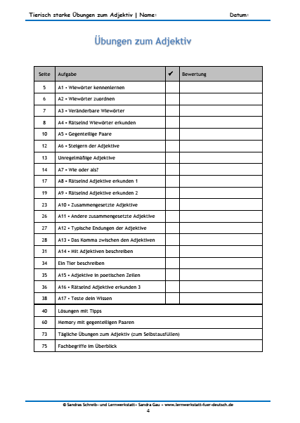 Dieses umfangreiche Lernmaterial bietet vielfältige Übungen rund um das Adjektiv. Die Kinder suchen Gegensätze, steigern Adjektive in allen drei Stufen, bilden Wortgruppen, verfassen Sätze und wenden zusammengesetzte Adjektive an. Adjektive werden in Beschreibungen, poetischen Zeilen sowie in anderen Texten erkannt und gezielt eingesetzt – verpackt in Rätseln, Zuordnungsaufgaben, Lückentexten und spielerischen Übungen.