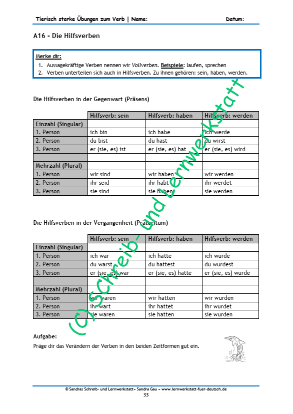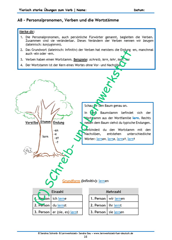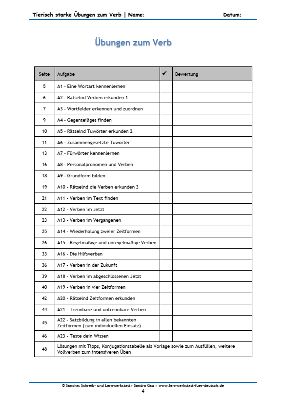 Wortfelder erkennen, Gegensätzliches finden, Zusammensetzungen verstehen, Personalpronomen kennenlernen, mit dem Wortstamm das Konjugieren lernen, Hilfsverben vom Vollverb differenzieren, regelmäßige und unregelmäßige Verben in den Zeitformen Präsens, Präteritum, Perfekt sowie Futur I verändern, rätseln und Gelerntes anwenden lernen - all dies befindet sich in dem 71-seitigen Lernmaterial.