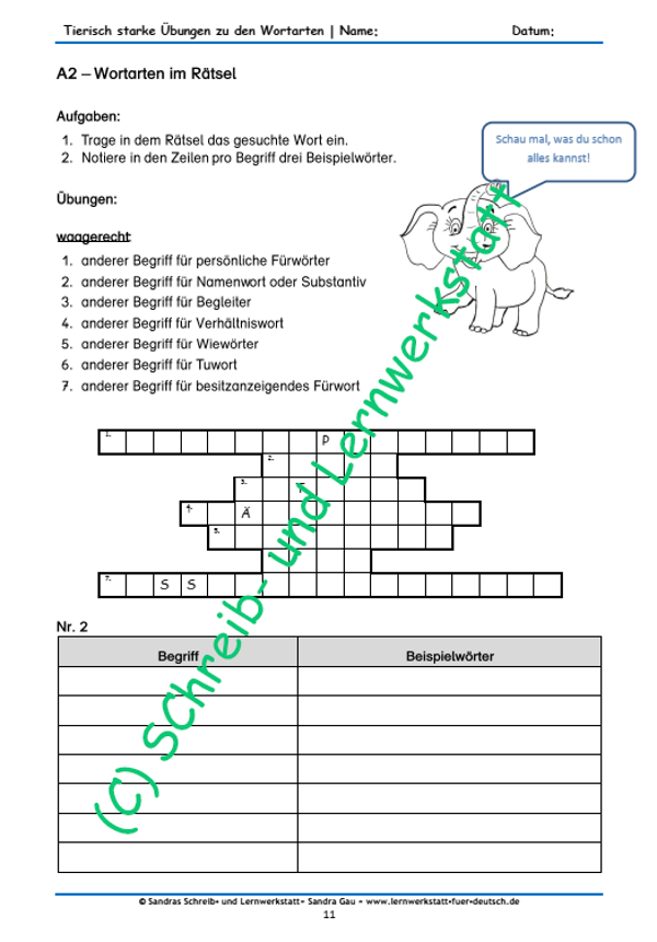 Ergänzende Lernmaterialien zur Grammatik, darunter Lernseiten aus der Lernmaterialserie ,,Graphomotorische Bilder und Schreibübungen".