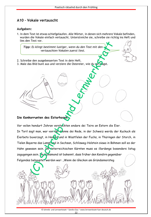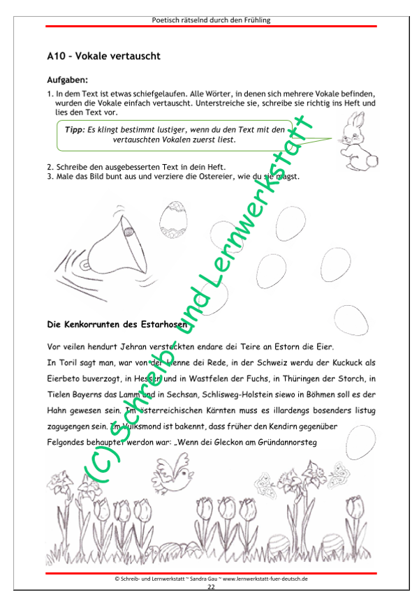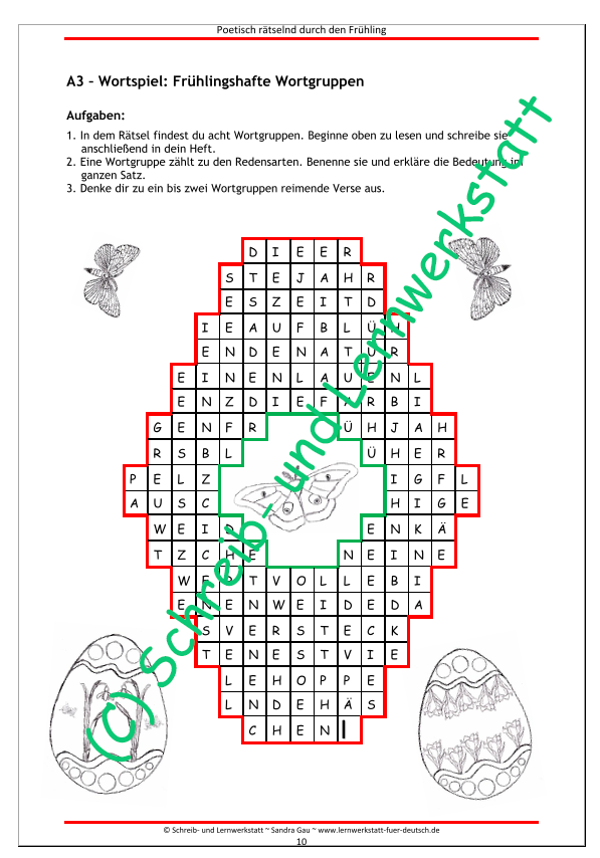 Die Mini-Poeten erforschen hier knobelnd ihren Frühlingswortschatz, nehmen verschiedene Wortarten unter die Lupe sowie Silben, müssen Wortgruppen erfassen, dichten eigene lyrische Zeilen, üben sich im Textverständnis sowie im Abschreiben, lesen und malen.