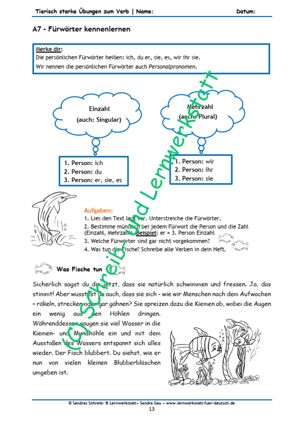 Es werden Verben kennengelernt, in Zeitformen verändert, Personalpronomen geschult, Artikelfindung steht bei den Nomen immer im Fokus und Präpositionen werden ebenso mit eingeflochten.