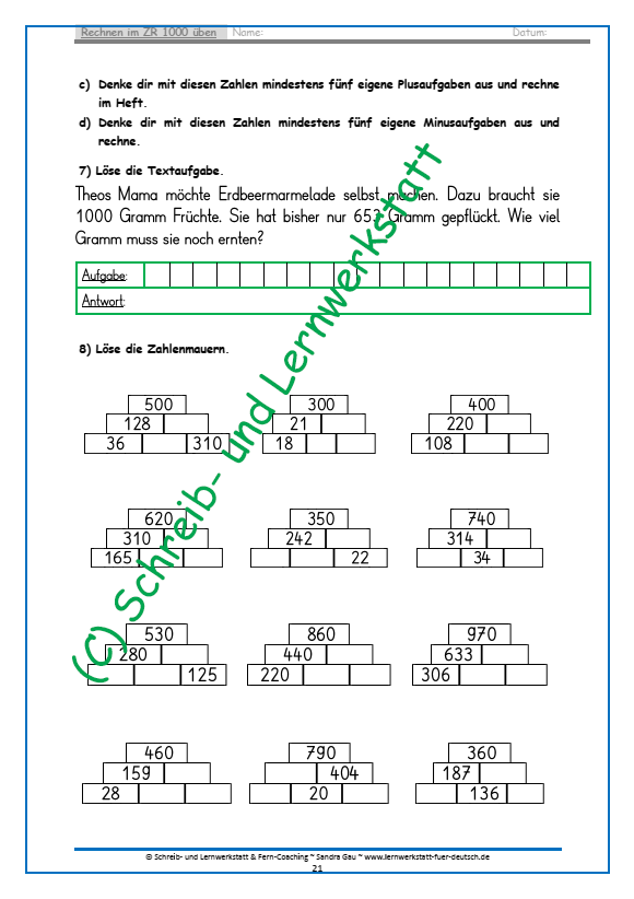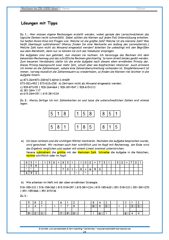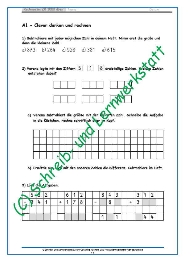 In den Ferien, in der Freizeit, im Förderunterricht oder in der Vertretungsstunde eignen sich Wiederholungen der Grundrechenarten Addition und Subtraktion im Zahlenraum 1000 besonders gut. Die Aufgaben richten sich primär an Förderschüler*innen, lassen sich aber auch im regulären Unterricht gezielt fordern.