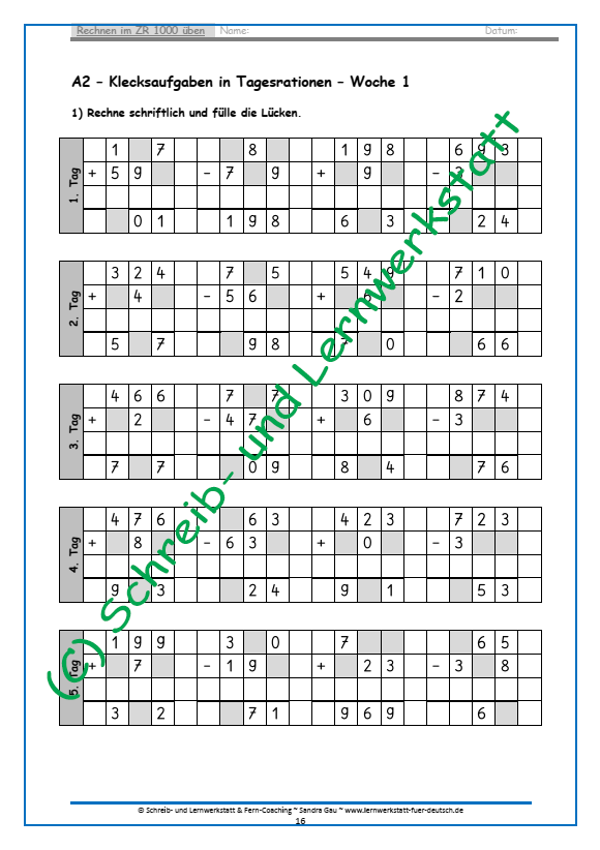 Das Lernmaterial bietet knifflige Aufgaben, bei denen die Rechnungen nach Anleitung selbst erstellt werden, passende Textaufgaben, Klecksaufgaben zum schriftlichen Rechnen im Tagesrhythmus und vieles mehr.