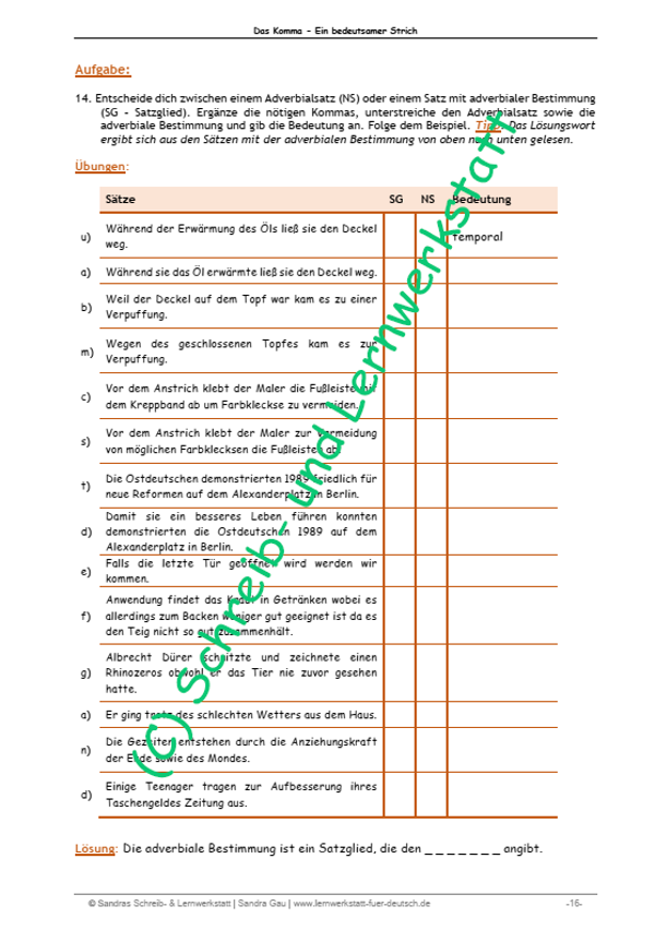 Dieses Lernmaterial bietet 16 abwechslungsreiche Übungen rund um die Adverbialsätze. Dabei erfassen die Schüler:innen das Thema von allen Seiten: Sie erkennen Adverbialsätze, unterscheiden zwischen Gliedsatz und Satzglied und üben die korrekte Kommasetzung. Zusätzlich werden Fachbegriffe erklärt und passende Konjunktionen übersichtlich gelistet. Die Lerneinheit schließt mit Lösungen, hilfreichen Tipps, Diktaten und verschiedenen Tafelbildern ab – ideal für die gezielte Übung, die Festigung des Wissens und für den nachhaltigen Lernerfolg.