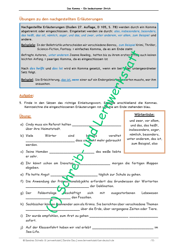 - praxisnahen Übungen: Texte lesen, Einschübe markieren, passende Kommas setzen, eigene Beispiele formulieren