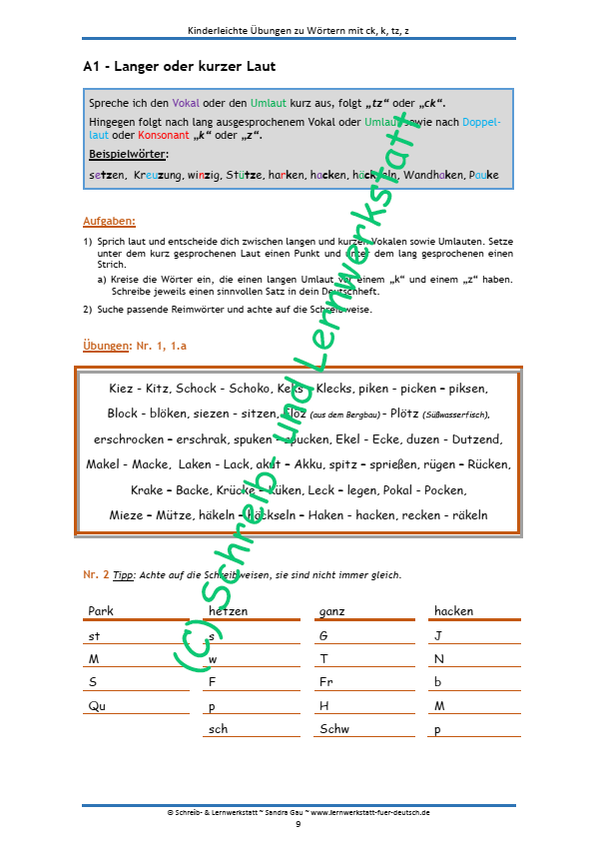 Kinderleichte Übungen mit Wörtern zu ck, k, tz, z