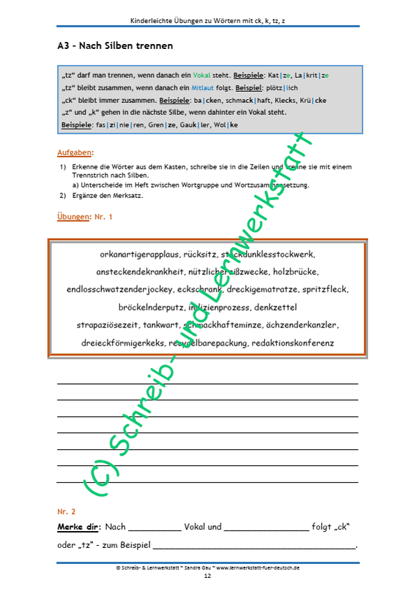 Klare Rechtschreibregeln erleichtern dem Lernenden den Zugang zur Wortstruktur. Das praxiserprobte Lernmaterial enthält abwechslungsreiche, in die Tiefe gehende Übungen zu Wörtern mit ck, k, tz, z sowie Rätsel. Zudem wird auf das Ableiten zum Wortstamm eingegangen und die Schreibweise begründet.