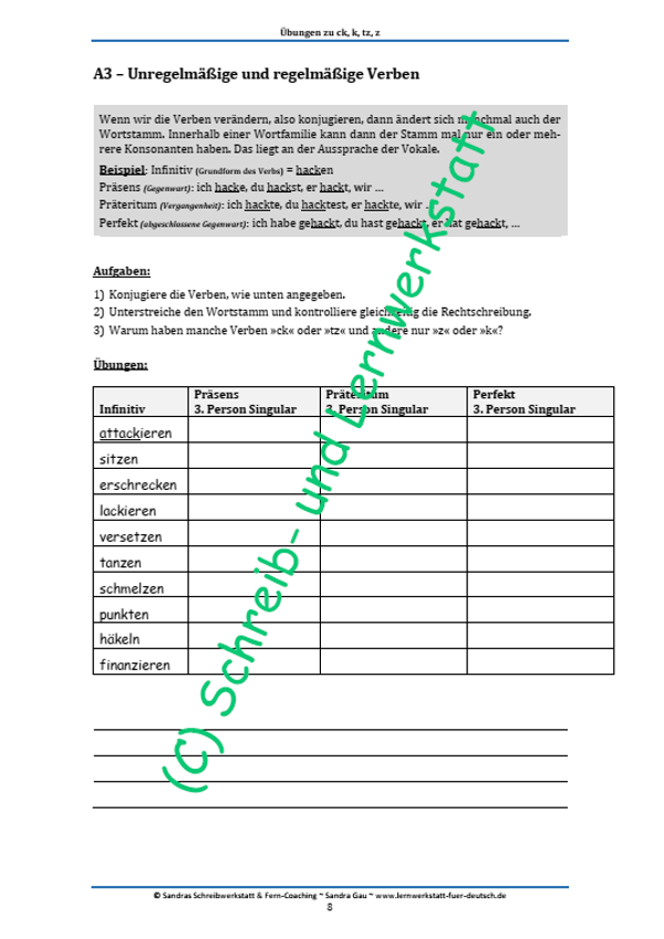 Das erprobte Lernmaterial geht den Wörtern mit ck, k, tz, z auf den Grund. Die Aufgabenstellungen sind in der Du-Form und richten sich an Erwachsene, die ihre Rechtschreibung für ihren Berufsalltag oder einfach für sich selbst verbessern wollen.