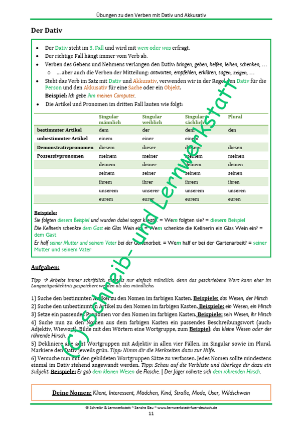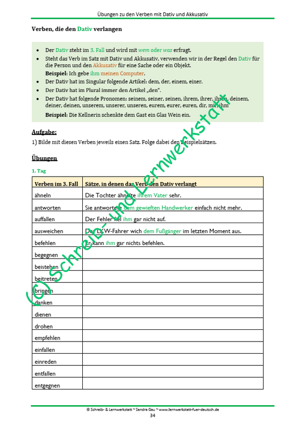 In diesen erprobten Lernseiten wird gezeigt, wie Verben den Satzbau bestimmen und welcher Fall (Dativ oder Akkusativ) danach folgt. Schritt für Schritt nimmst du speziell die beiden Fälle unter die Lupe und erfährst, welche Verben welchen Fall fordern, damit du sofort richtige Sätze bildest.