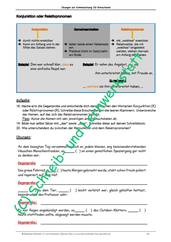 Dieses praxiserprobte Lernmaterial richtet sich gezielt an Erwachsene, die ihre Kommasetzung im Alltag sicherer und effizienter beherrschen möchten. Es enthält praxisnahe Übungen samt Lösungen, eine kompakte zweiseitige Liste der wichtigsten Konjunktionen und gezieltes Üben von Signalwörtern.