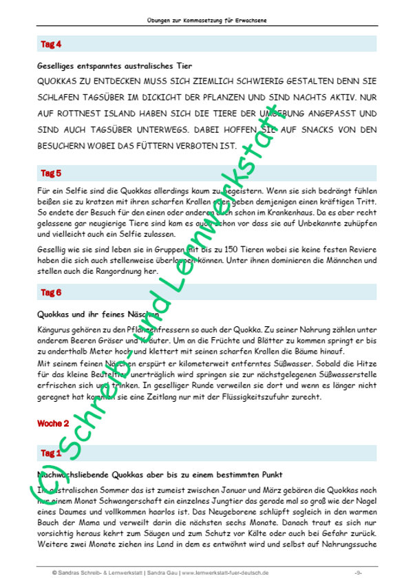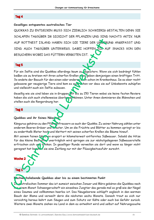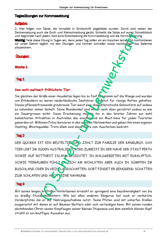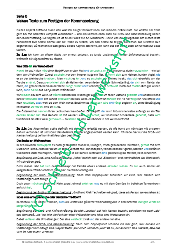 Diese praxiserprobten Lernseiten, die gezielt für Erwachsene erstellt wurden, können die Zeichensetzungsfähigkeiten verinnerlicht werden. Die täglichen Übungen sind in Tagen geplant und erstrecken sich über mehr als sechs Wochen, sodass alles Gelernte vertieft werden kann. Dabei werden auch Groß- und Kleinschreibung wiederholt, was eine ergänzende Übungseinheit neben dem Grammatiktraining darstellt. Ideal für alle, die ihre Deutschkenntnisse verbessern und ihre Schreibfähigkeiten ausbauen möchten.