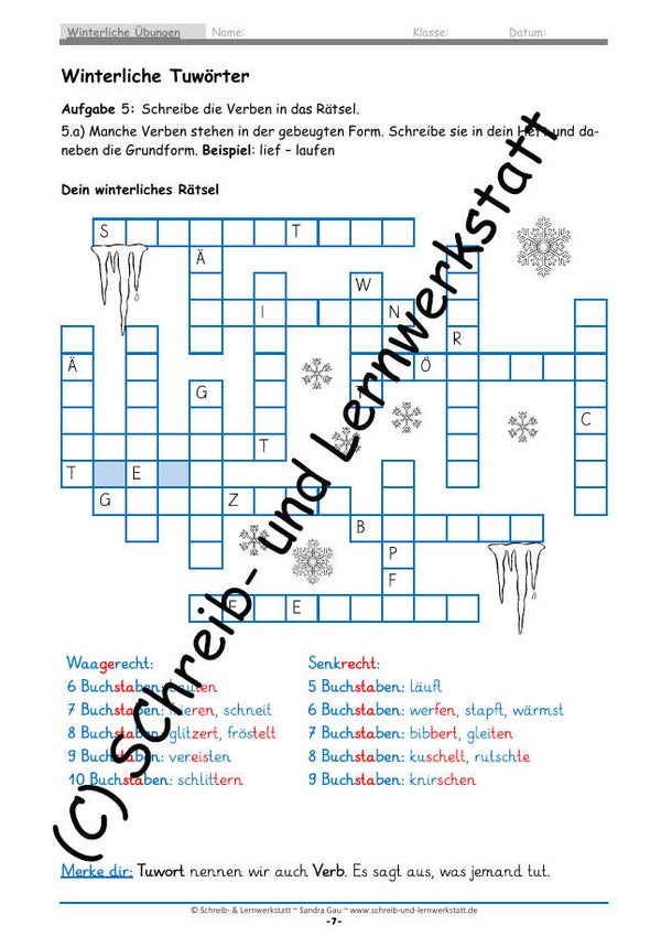 Winterliche Verben: Ein Kreuzworträtsel macht mit typischen Winter-Tuwörtern vertraut und stärkt deren Anwendung.