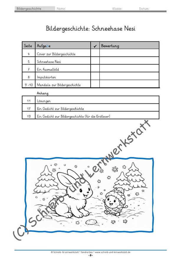 Mit der Bildergeschichte „Schneehase Nesi“ erhalten Kinder der 2. und 3. Klasse einen motivierenden Zugang zum Erzählen, Schreiben und Sprechen. Die winterliche Geschichte rund um Schneehase Nesi, den Tannenzapfen Zapfi und die Elfe Epi lädt dazu ein, Bilder genau zu betrachten, Wörter zu finden und eigene Gedanken sprachlich auszudrücken.