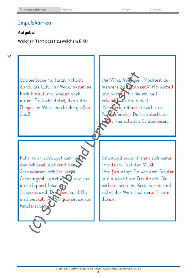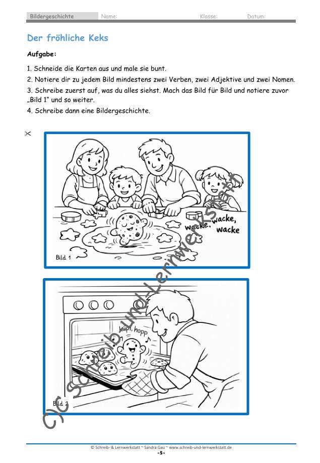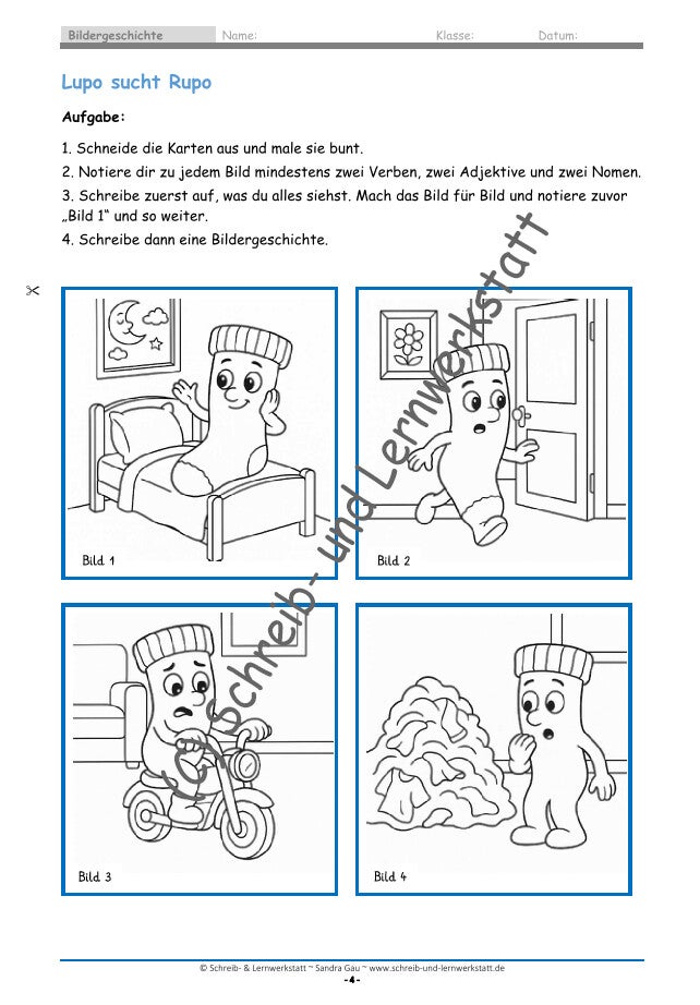Die enthaltenen Bilder dienen als visuelle Impulse, die Schülerinnen und Schüler dazu anregen, eigene Geschichten zu entwickeln, Handlungen zu planen und Texte strukturiert zu verfassen. Durch die Kombination aus Bildmaterial und begleitenden Lernseiten wird kreatives Schreiben gezielt unterstützt.