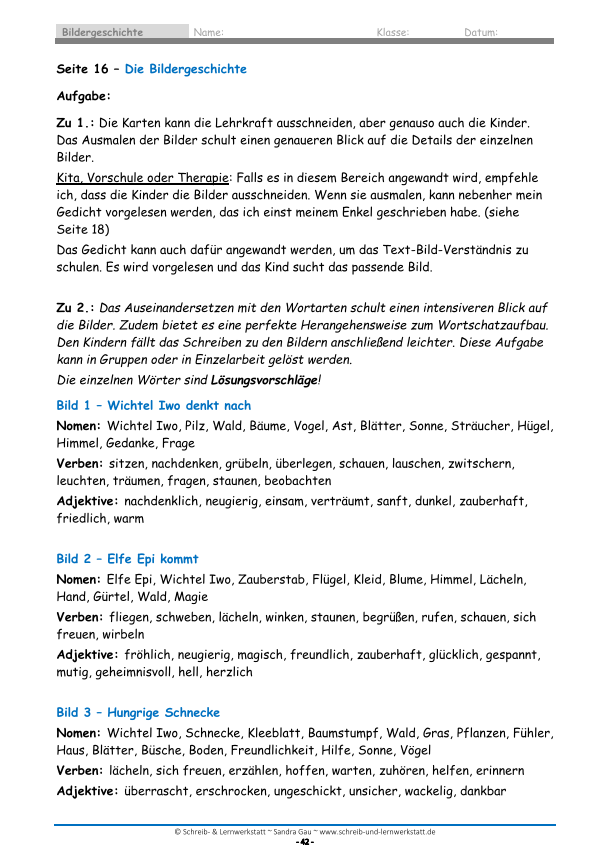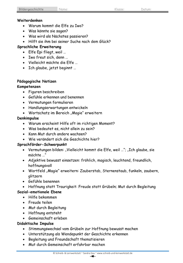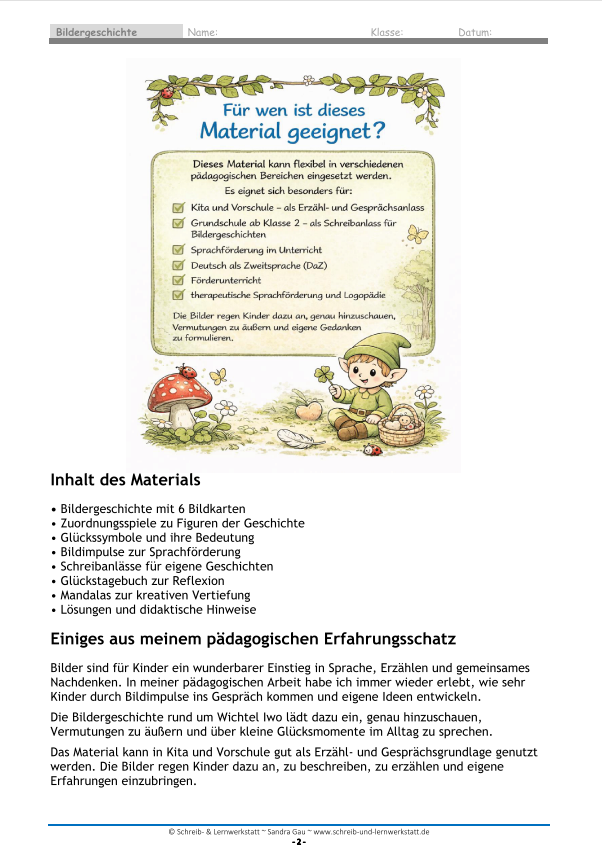 Das Material verbindet Sprachförderung, kreatives Schreiben und soziales Lernen. Gleichzeitig werden Wortschatz, Ausdrucksfähigkeit und die Fähigkeit zur Bildbeschreibung gefördert.