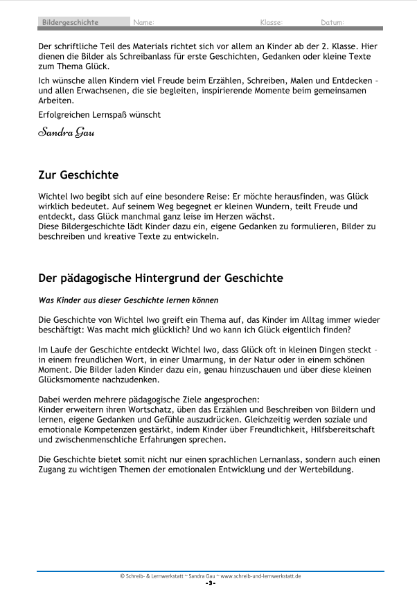 Besonders wertvoll ist die Kombination aus Bildimpulsen, Schreibanlässen und Reflexionsaufgaben, durch die Kinder nicht nur Geschichten entwickeln, sondern auch über Glücksmomente im eigenen Alltag nachdenken.